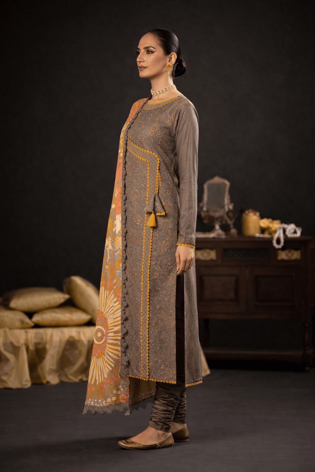 Grey & Mustard Embroidered Dress